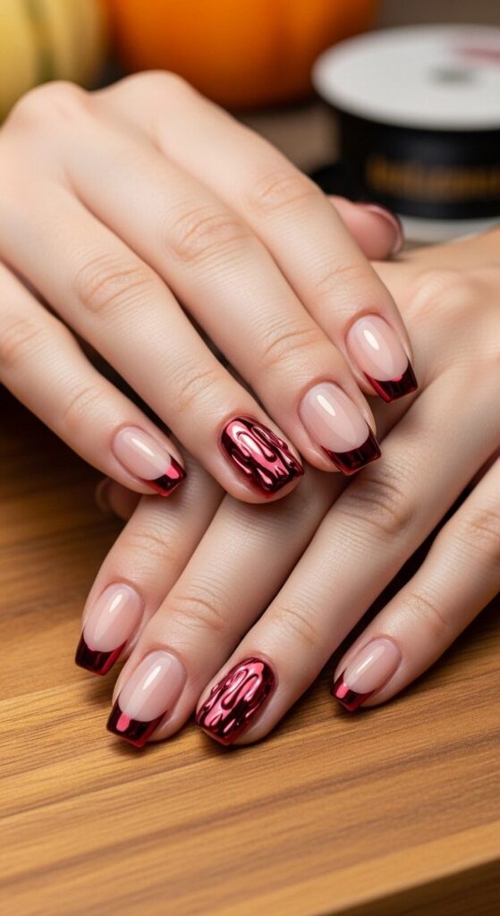 A tiny bit of shine goes a long way. Paint a sheer pink or soft nude base on all nails. Choose one or two accent nails per hand and add a deep oxblood chrome “drip” starting at the cuticle line. To get the chrome effect, layer a metallic red under a rub-on red chrome powder, then top with a high-gloss sealer so the drops look convex and wet. The rest of the nails stay low-key, which keeps the design adult and balanced.