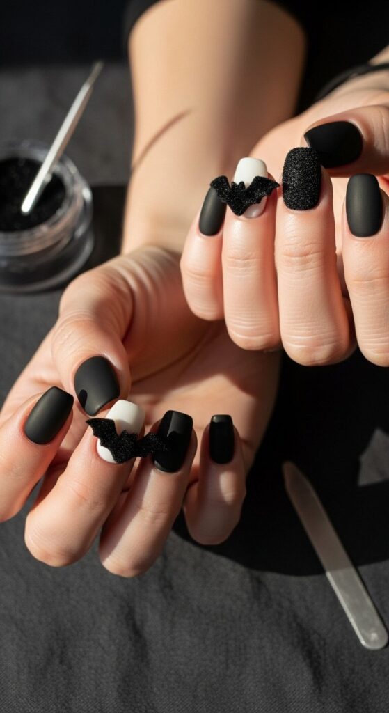 Textural play makes simple colors feel expensive. Start with a full matte black or charcoal base. On one accent nail per hand, paint a thin bat silhouette or a small crescent moon with adhesive, then press on ultra-fine black flocking powder to create a velvet relief. The tone-on-tone effect is subtle in the shade and dramatic when light rakes across it. Balance the set by keeping other nails clean—maybe a single glossy stripe down the middle of one nail for echo.