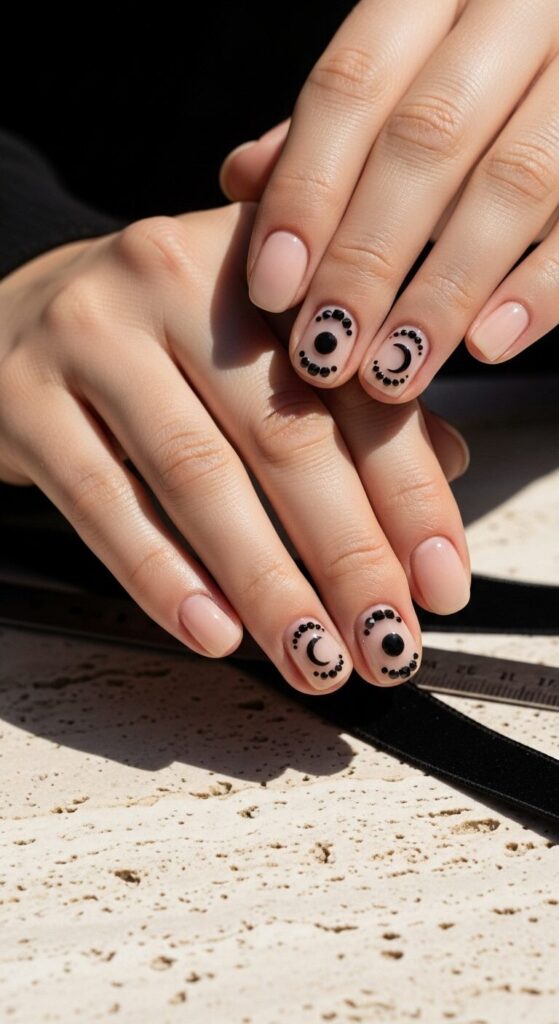 Go jewelry-level minimal. Paint a sheer beige base. Down the center of the middle finger and ring finger on each hand, place a short vertical line of tiny matte-black micro-studs: full moon, half, crescent, tiny dot—arranged as phases. Keep spacing even and the line straight using a striping guide. The rest of the nails stay sheer and glossy. It’s more “couture talisman” than costume.
