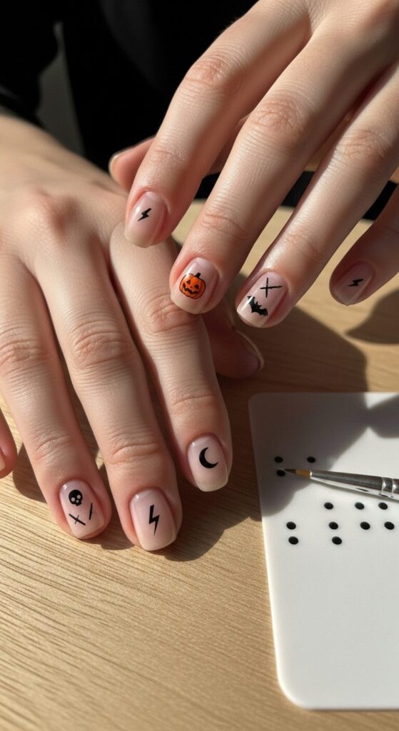 For maximal fun with minimal effort, assign one tiny icon to each nail: a single bone-white skull dot (with micro eyes) on one, a whisper-thin black lightning bolt on another, a petite pumpkin outline on another, and so on—each nail gets one simple mark on a sheer or soft-sand base. Keep the icons small and well spaced. The set reads clever and curated, not busy, and grows out gracefully.