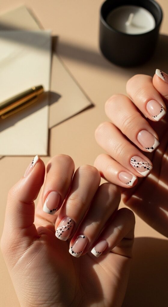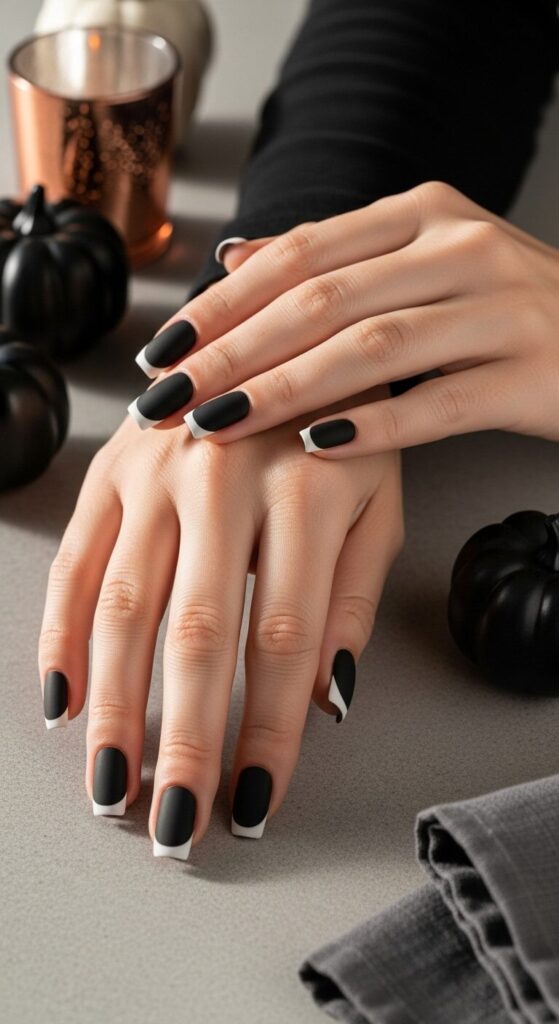 Swap the classic glossy French for a modern, midnight version. Start with a full matte black base on all nails. Using a fine brush, paint crisp, bone-white French tips—slim, no wider than two millimeters—so they read like a clean graphic line. The contrast is sharp and wearable; it’s spooky in spirit but minimal enough for everyday. Seal only the tips with a satin or glossy topcoat to create a “texture French” that catches light without compromising the matte body.