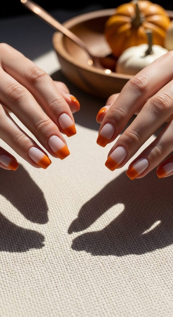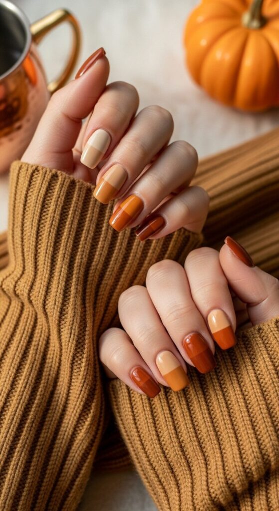 This is an easy, cozy gradient that never looks childish. Choose five pumpkin-adjacent shades ranging from cream to burnt sienna. Paint each nail a single shade, lightest on the thumb to deepest on the pinky, or vice versa. Keep the finish creamy and glossy. If you want a tiny nod to Halloween, add an ultra-thin black contour line at the free edge of only one nail per hand. It’s refined and makes sweaters look intentional.