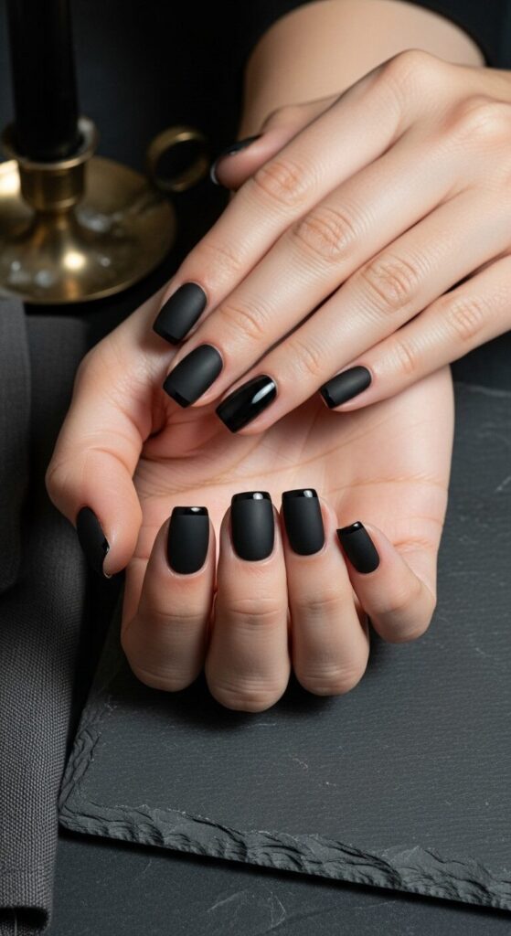 Flip the French. Paint nails with matte black topcoat for a velvety base. Then, with a striping brush, apply a super-thin glossy black line at the cuticle curve—the reverse French—so the shine edge frames growth in an elegant crescent. Keep lines uniform and tight to the cuticle for a stealthy, luxe effect. This works beautifully on short nails and wears well as your nails grow.