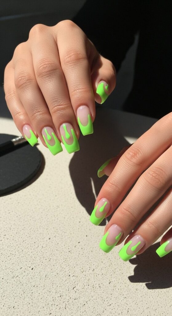 For a playful twist that still reads chic in daylight, try clear or milky bases with neon slime “drips” at the tips in lime-green glow polish. Keep the drip shapes rounded and varied, and cap the free edge well so the luminous pigment doesn’t chip. In normal light, the lime looks edgy; in the dark, the tips glow for a party-ready surprise. Add a thin black micro-line under the slime if you want extra definition.