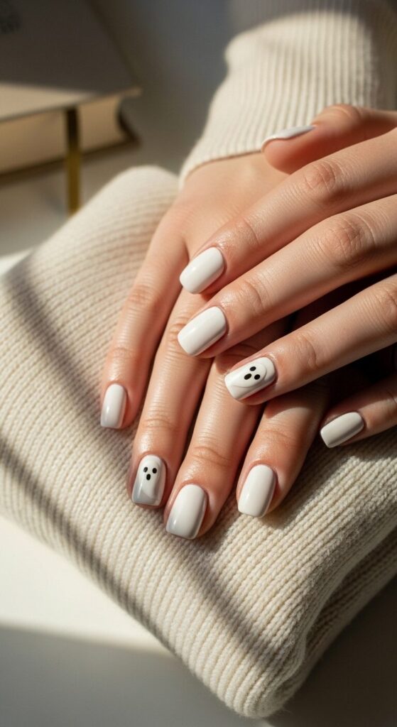 Think quiet, not kitsch. Paint nails in bone white with a porcelain-like shine. On two nails per hand, place minimalist ghost decals: soft oval silhouettes with tiny black oval eyes, nothing more. Keep placement off-center for a designer feel. The rest of the nails stay plain. This reads like a gallery print—crisp, clever, and very photogenic with knitwear.