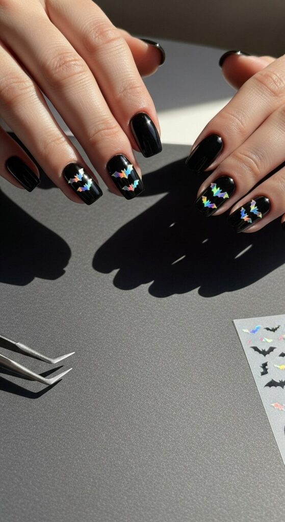 Paint a jet-black base and top with a no-wipe topcoat for slick shine. Apply micro bat silhouettes in holo foil or iridescent decals across two nails per hand—keep them tiny and scattered, as if in flight. The bats flash rainbow in sunlight and look subtle indoors. Finish with another thin layer of glossy topcoat to lock edges. It’s graphic, quick, and surprisingly sophisticated.