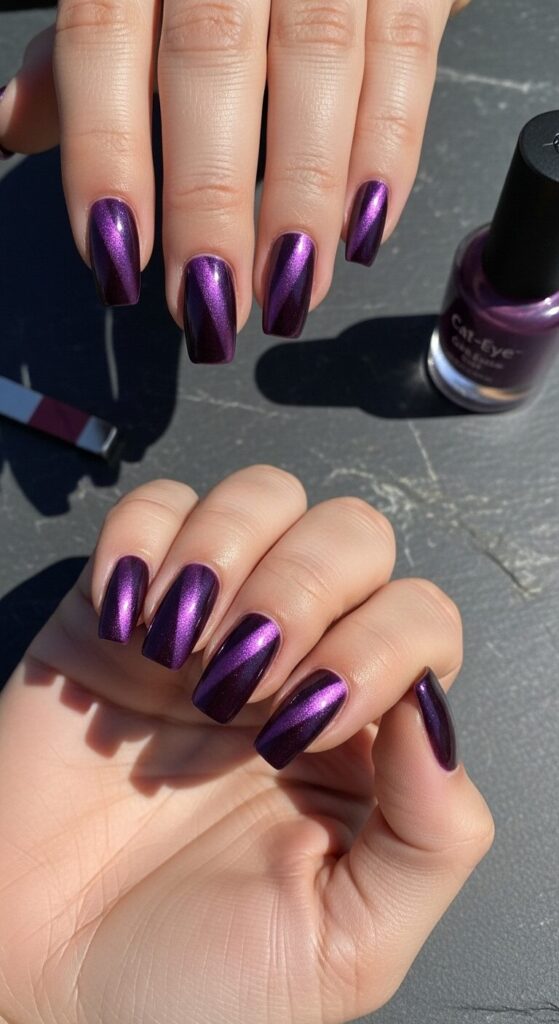 If you like dimensional shimmer, cat-eye gel in deep violet is a showstopper. After two color coats, activate the magnetic pigment with a bar magnet at a diagonal to create a comet-like streak across each nail. The effect changes with the angle of light and feels like falling night sky—mystical but not loud. Keep shapes short and oval for a luxe look, and seal with glossy topcoat.